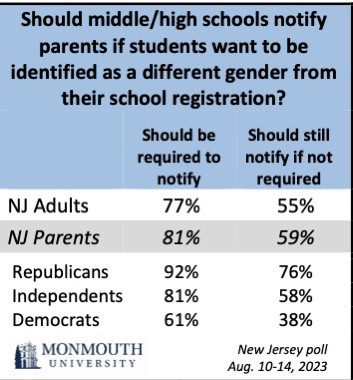 First, the Monmouth poll. Being a reputable polling institution, Monmouth addressed the parental notification policies in a direct and straightforward manner. Below is the Monmouth question and the responses from the various groupings: