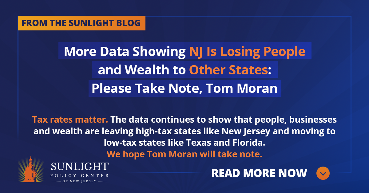New IRS data confirms what Sunlight has been saying. For 2019-20, New Jersey saw a net outmigration of 12,798 taxpayers and $2.35 billion of adjustable gross income (AGI). For the decade of 2010-2020 (the decade Moran refers to), there was a net outmigration of 200,765 taxpayers and $25.7 billion of AGI. And remember that a net outflow of $25.7 billion of AGI greatly understates the income New Jersey has lost because it only counts the income from the single year when the outmigrant left the state. But many if not most outmigrants – especially retirees – leave New Jersey forever. Their income is lost to the state for many years, even decades, so the actual amount of the outflow of wealth is multiples higher than $25.7 billion.