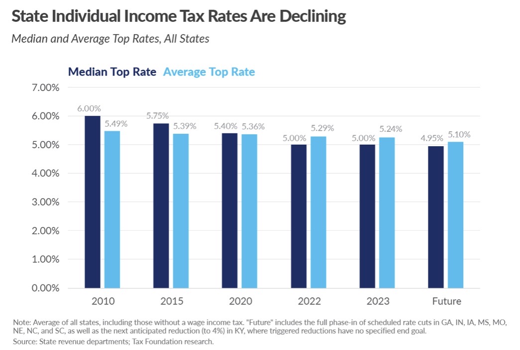 All told, 43 states reduced their tax burdens in 2021-22, and 21 of them cut income taxes. As the chart below shows (larger version of the chart here), the national median top income tax rate declined from 5.40% in 2020 to 5% in 2022. By contrast, Murphy raised New Jersey’s top rate from 8.93% to 10.75%.